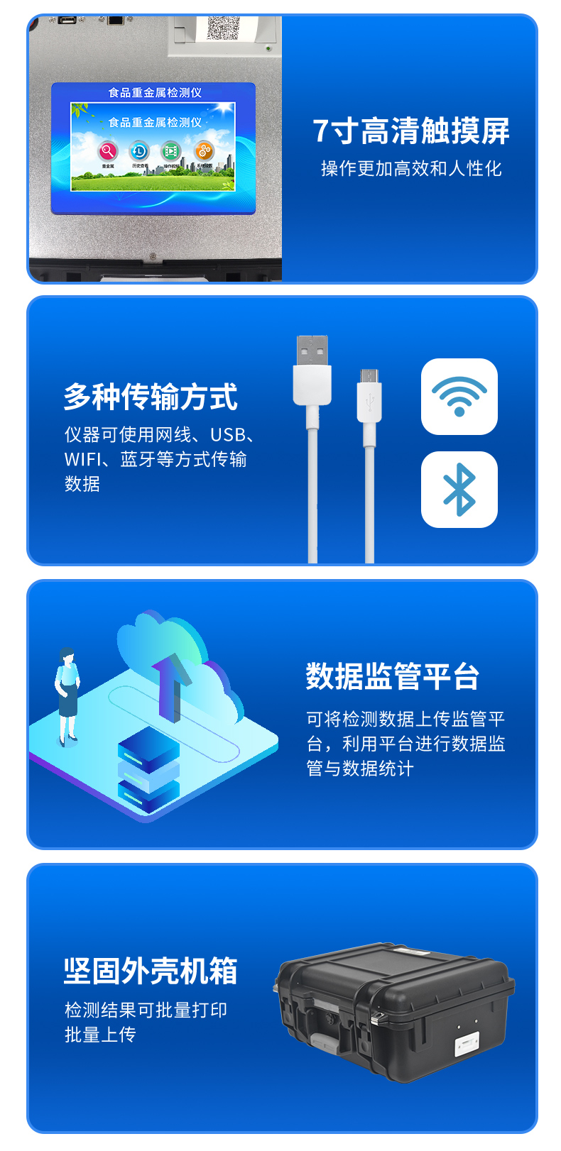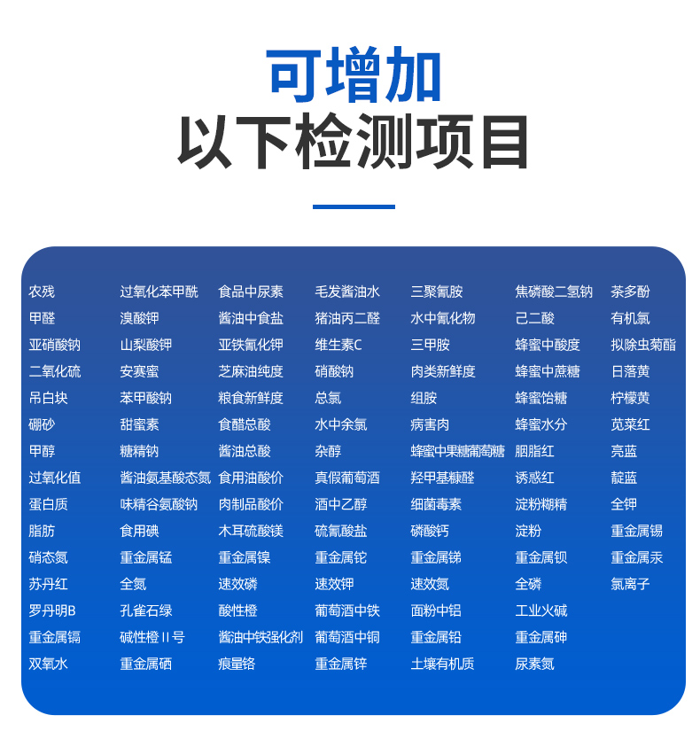 儀器采用臺式一體化系統(tǒng)檢測技術(shù),將分光光度模塊、新型農(nóng)殘檢測模塊、數(shù)字化管理模塊、無線通訊模塊高度集成于一體,支持檢測200種食品安全檢測項(xiàng)目,同時(shí)預(yù)留升級檢測方法。儀器檢測模塊標(biāo)準(zhǔn)化、智能化,可隨意自由組合。檢測箱體內(nèi)置多個(gè)標(biāo)準(zhǔn)檢測單元,檢測模塊可以調(diào)整配置。儀器采用全新安卓智能系統(tǒng),主控芯片采用 ARM Cortex-A7,RK3288/4核處理器,10.1寸高清液晶觸摸豎屏,更加**的UI交互界面,運(yùn)轉(zhuǎn)快捷;儀器配備無線通信模塊: 4G(APN)通訊模塊、Wifi模塊,藍(lán)牙傳輸,同時(shí)具有雙USB接口以及RJ45接口能以多種方式實(shí)現(xiàn)數(shù)據(jù)保存和數(shù)據(jù)傳輸功能。創(chuàng)新檢測模式:★檢測通道:≥12通道;采用精密旋轉(zhuǎn)比色池設(shè)計(jì),使用同芯片同光源校準(zhǔn)精度,解決不同光源之間的誤差值。1-12通道間誤差0.1%。(***:**202022821055.2)★儀器具有自動(dòng)識別比色皿檢測功能,即:將樣品比色皿放入儀器后,點(diǎn)擊樣品檢測,儀器自動(dòng)識別比色皿進(jìn)行通道檢測。進(jìn)口高精光源:高精度進(jìn)口四波長冷光源,通道配置 410、520、590、630nm 波長光源,一個(gè)光源芯片驅(qū)動(dòng)一個(gè)光源,誤差極小,每臺設(shè)備單獨(dú)**校準(zhǔn)光源,**比對,同時(shí)參照四種不同波段光源全方位覆蓋市面上99%的農(nóng)殘食品項(xiàng)目檢測。智能化操作系統(tǒng):便捷操作系統(tǒng):設(shè)備檢測時(shí)可在同一檢測界面自動(dòng)對應(yīng)相關(guān)檢測通道一次性選擇1-12個(gè)樣品名稱,無須退出界面,節(jié)省操作時(shí)間。數(shù)據(jù)集成系統(tǒng):設(shè)備首頁自動(dòng)統(tǒng)計(jì)檢測數(shù)據(jù)包含:周檢測數(shù)據(jù)、月檢測數(shù)據(jù),全部檢測總數(shù)量,均包含檢測總數(shù),合格數(shù),不合格數(shù),以及相關(guān)柱形分析圖,對各項(xiàng)檢測數(shù)據(jù)清晰掌握,無需電腦查詢,更加快捷直觀。項(xiàng)目預(yù)設(shè)系統(tǒng):支持添加單個(gè)及多個(gè)相同或不相同的任務(wù)預(yù)設(shè),一鍵快速調(diào)取,每一個(gè)任務(wù)分別可以設(shè)置不同的樣品、批次、編號、來源、備注、抽樣信息、檢測信息、受檢信息、復(fù)核信息等更多信息。無縫鏈接平臺和APP實(shí)時(shí)查看下發(fā)任務(wù)。數(shù)據(jù)監(jiān)管系統(tǒng):同步對接監(jiān)管平臺,數(shù)據(jù)可局域網(wǎng)和互聯(lián)網(wǎng)數(shù)據(jù)上傳,檢測結(jié)果可選擇直接傳至食品安全監(jiān)管平臺。集成OSS輸出存儲服務(wù)、區(qū)分設(shè)備定向管理應(yīng)用,進(jìn)行區(qū)域食品安全監(jiān)管及大數(shù)據(jù)分析處理與數(shù)據(jù)統(tǒng)計(jì),檢測區(qū)域食品安全長短期動(dòng)態(tài),達(dá)到食品安全問題預(yù)估、預(yù)警。自定義打印系統(tǒng):內(nèi)置全新打印系統(tǒng),新創(chuàng)自定義打印方式,可按需靈活設(shè)置開啟或關(guān)閉:產(chǎn)品合格證(國家農(nóng)業(yè)部標(biāo)準(zhǔn)要求),二維碼,抽樣信息、檢測信息,受檢信息、復(fù)核信息、抽樣日期、檢測日期等信息的打印。系統(tǒng)遠(yuǎn)程更新功能:可定向分客戶分儀器更新系統(tǒng),按照不同客戶后期實(shí)際需求添加項(xiàng)目,無需機(jī)器返廠,即可遠(yuǎn)程實(shí)時(shí)升級全新系統(tǒng),節(jié)省時(shí)間成本及避免運(yùn)輸造成設(shè)備損壞。儀器主機(jī)采用一體化防水、抗壓、防撞擊、防腐蝕箱體設(shè)計(jì),同時(shí)配備交直流供電,可連接車載電源,可選配大容量充電鋰電池,滿足現(xiàn)場野外檢測需求。安全證書,放心保障:儀器具有中國計(jì)量科學(xué)研究院校準(zhǔn)證書,權(quán)威認(rèn)證。