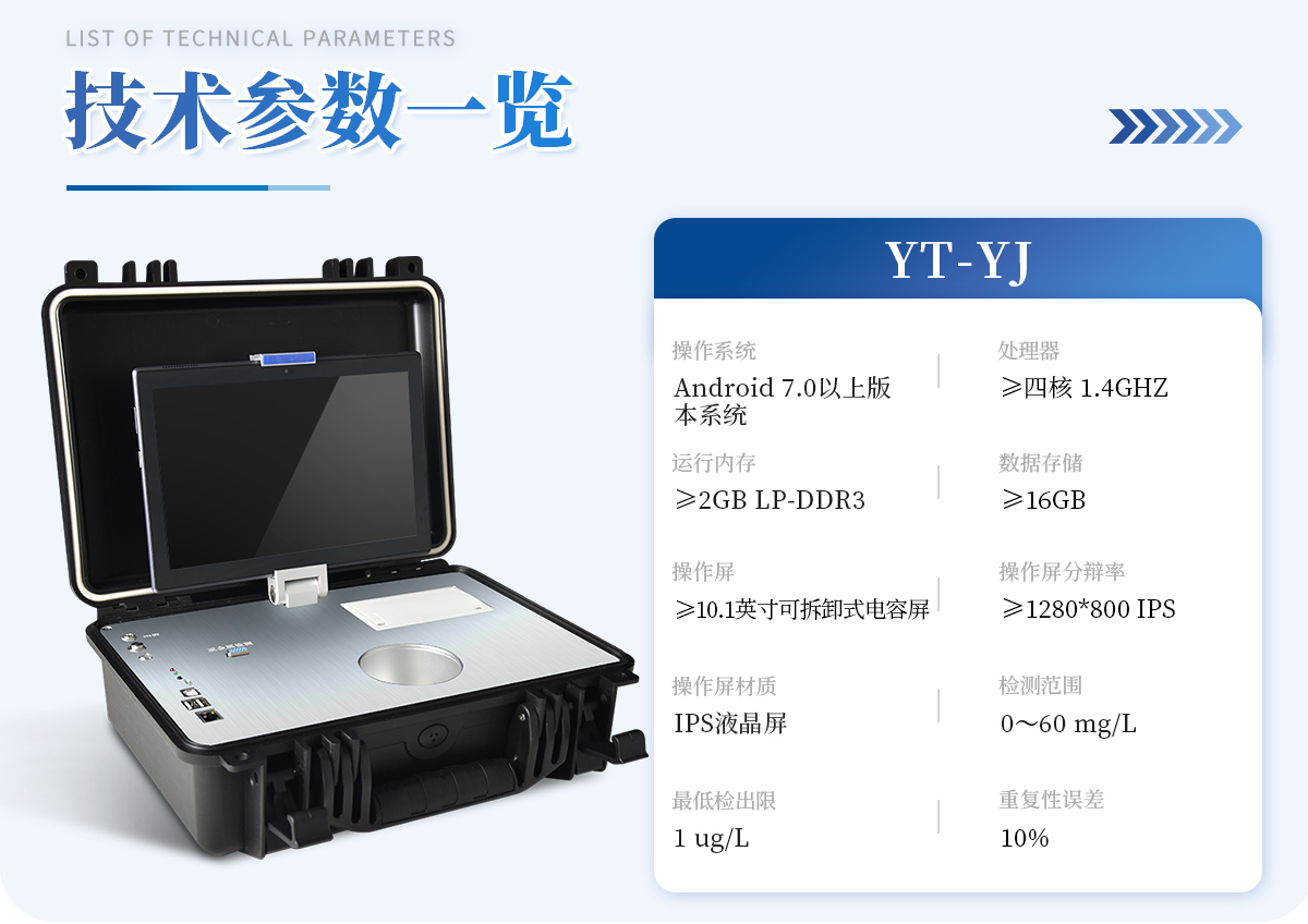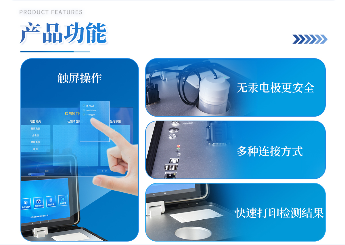 | 基本概述:便攜式箱體化一體機(jī),采用防水、抗壓、防撞擊、防腐蝕箱體設(shè)計(jì),滿足車載環(huán)境、無(wú)電源環(huán)境以及戶外檢測(cè)需求; | 主機(jī):具備檢測(cè)功能、輔助功能、管理系統(tǒng)軟件、信息化管理功能,信息化實(shí)現(xiàn)數(shù)據(jù)雙向傳輸,能直接接收管理中心下發(fā)任務(wù),并實(shí)時(shí)上報(bào)檢測(cè)結(jié)果至管理平臺(tái); | 檢測(cè)技術(shù):采用陽(yáng)極溶出伏安法檢測(cè)技術(shù); | 操作系統(tǒng):Android 7.0以上版本系統(tǒng); | 處理器:≥四核 1.4GHZ; | 運(yùn)行內(nèi)存:≥2GB LP-DDR3; | 數(shù)據(jù)存儲(chǔ):≥16GB; | 通訊接口:包含兩個(gè)USB接口、網(wǎng)線接口、WIFI、藍(lán)牙、4G模塊,內(nèi)置GPS接口,用于戶外或者其他移動(dòng)檢測(cè)定位; | 指示燈:具有熱敏打印機(jī)工作指示燈,用于提示打印機(jī)工作狀態(tài);具有電源充電指示燈,用于提示儀器充電狀態(tài);具有無(wú)線藍(lán)牙對(duì)接狀態(tài)提示燈,用于提示操作平臺(tái)與儀器主機(jī)連接狀態(tài);具有儀器工作狀態(tài)提示燈,用于提示儀器主機(jī)是否處于工作狀態(tài); | 操作屏:≥10.1英寸可拆卸式電容屏設(shè)計(jì),操作屏可以固定在儀器上,也可以取出單獨(dú)操作實(shí)現(xiàn)運(yùn)程控制; | 操作屏分辯率:≥1280*800 IPS; | 操作屏材質(zhì): IPS液晶屏; | 輸入方式: 電容屏、觸摸輸入、支持多點(diǎn)觸控; | 采用無(wú)汞電極,安全無(wú)毒; | 模塊自帶攪拌功能,啟動(dòng)后既可自動(dòng)攪拌溶液。 | 檢測(cè)范圍: 0~60 mg/L ,**檢出限:1 ug/L; | 重復(fù)性誤差: 10%; | 具有自動(dòng)尋峰功能,計(jì)算出樣品**數(shù)據(jù); | 內(nèi)置線性掃描、常規(guī)脈沖掃描、微分脈沖掃描; | 儀器現(xiàn)場(chǎng)取證功能: 儀器具有800萬(wàn)以上防抖、自動(dòng)對(duì)焦高清攝像頭,對(duì)檢測(cè)實(shí)樣進(jìn)行現(xiàn)場(chǎng)拍照取證; | 電源控制器: 雙電源控制器,節(jié)省電量; | 運(yùn)程控制:支持20米內(nèi)無(wú)線藍(lán)牙控制儀器檢測(cè),方便使用者沒(méi)在儀器身邊時(shí)也能完成項(xiàng)目檢測(cè); | 打?。?/strong> 內(nèi)置微型熱敏打印機(jī),可隨時(shí)打印檢測(cè)結(jié)果; | 電池:內(nèi)置大容量可充電鋰電池,可連續(xù)工作5小時(shí)以上; | 箱體: 便攜一體化手提箱,箱體能防水,抗壓,整機(jī)重量小于5kg,攜帶方便; |