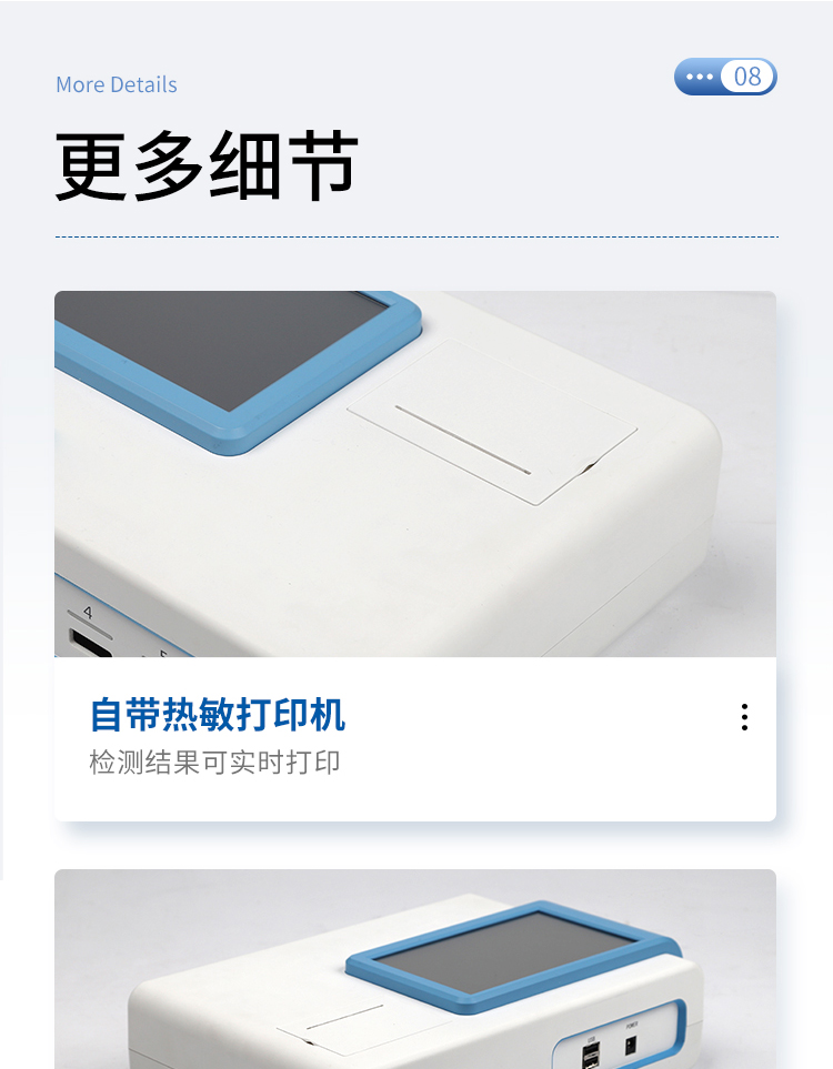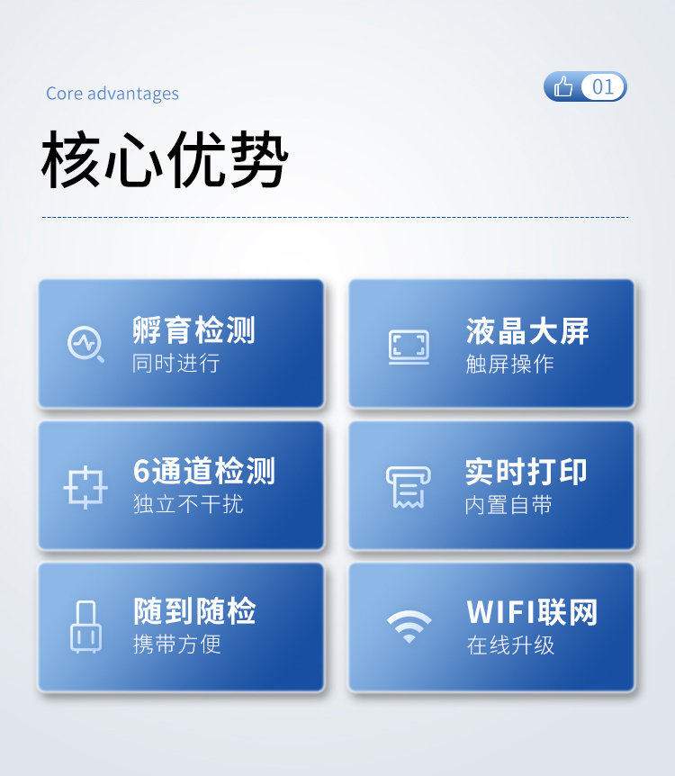 一體化設計,集成孵育和檢測功能同時進行,孵育完成直接檢測;全中文 7英寸高清液晶顯示,觸摸屏操作;Android 系統(tǒng),支持在線升級,可WIFI聯(lián)網(wǎng);檢測原理:熒光定量免疫層析法;6通道設計,可同時進行一種或多種指標的檢測,6個獨立檢測單元,檢測效率高,并且互不干擾;具有二維碼自動識別系統(tǒng),可直接識別檢測項目、檢測流程等信息;儀器自帶熱敏打印機,檢測結果可實時打??;具有檢測數(shù)據(jù)存儲(存儲數(shù)量不少于 10000 條)、查詢、批量數(shù)據(jù)處理和打印功能;儀器≥2 個USB 接口,可拷貝結果及原始數(shù)據(jù),具有 wifi 接入模塊,可通過無線連接網(wǎng) 絡實現(xiàn)數(shù)據(jù)上傳;分鐘內(nèi)達到工作狀態(tài)(37℃),封閉系統(tǒng),不受外界環(huán)境(光、熱)干擾,工作環(huán)境溫度:0-30℃;相對極差≤10%;重復性 CV≤1%;批間變異≤3%;尺寸310x210x93mm