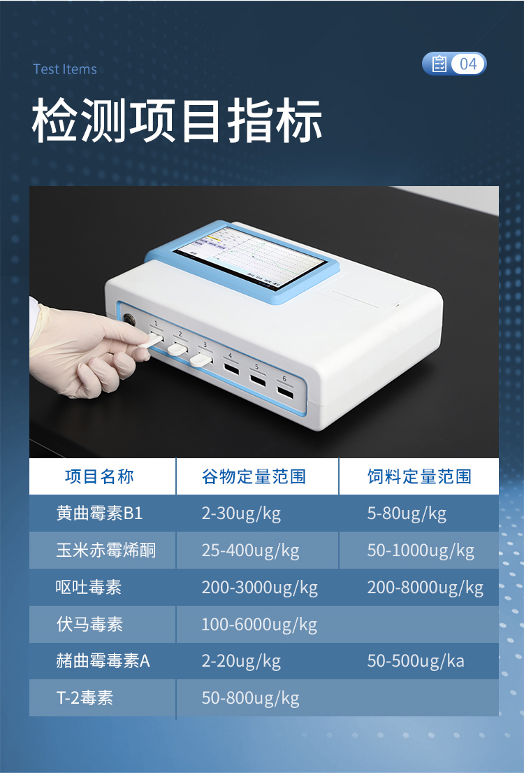YT-L03型真菌毒素快速檢測儀采用熒光定量快速檢測原理,主要檢測糧油谷物飼料中真菌毒素含量,包括黃曲霉毒素、玉米赤霉烯酮、嘔吐毒素、伏馬毒素、赭曲霉毒素、T-2毒素等等,檢測樣品涵蓋糧食谷物(大米、玉米、小麥、大麥、高粱等)及其制品、飼料及其原料、食用油脂、牛奶及其制品等;樣品前處理簡單,整個檢測過程檢測12min,產(chǎn)品適用于地方糧庫、谷物生產(chǎn)企業(yè)、飼料廠、各類畜牧養(yǎng)殖企業(yè)、面粉廠、食品加工廠、第三方檢測機構及各級政府監(jiān)管部門。